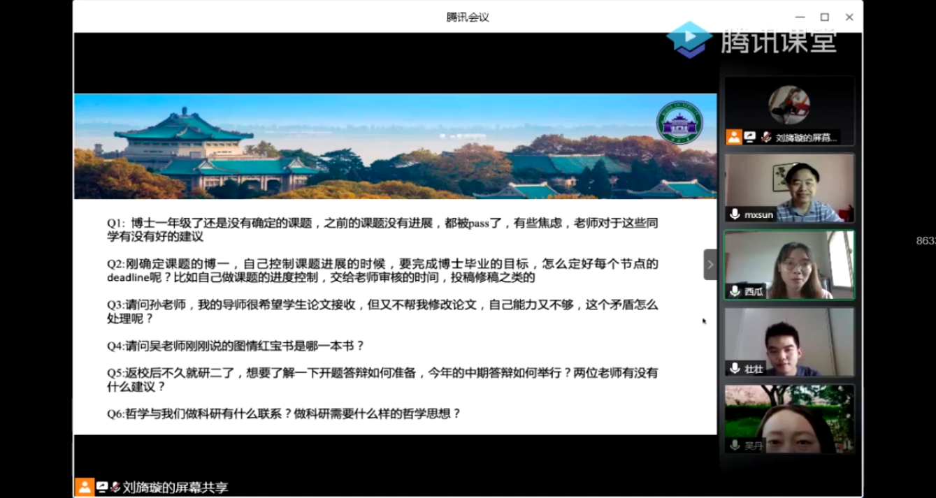 本次“好导师公开课”第一期—“重返‘珈园’,开启科研新篇章”圆满结束了,通过两位老师的答疑解惑,同学们纷纷表示收获满满对于即将返校的这段时间如何调整心态、返校后如何更高效的开始科研,都有了更好的规划,并向两位老师表达了感谢。
