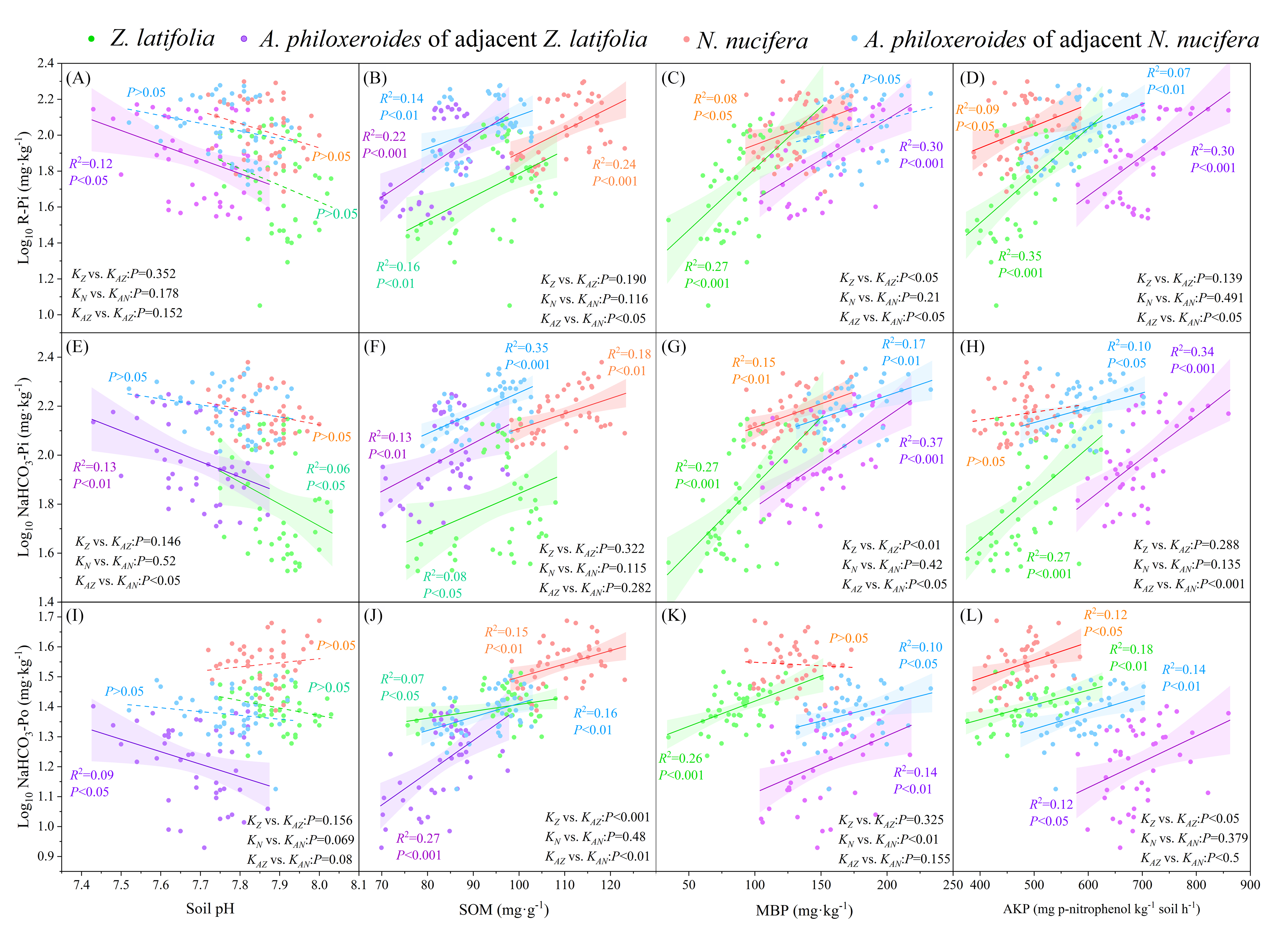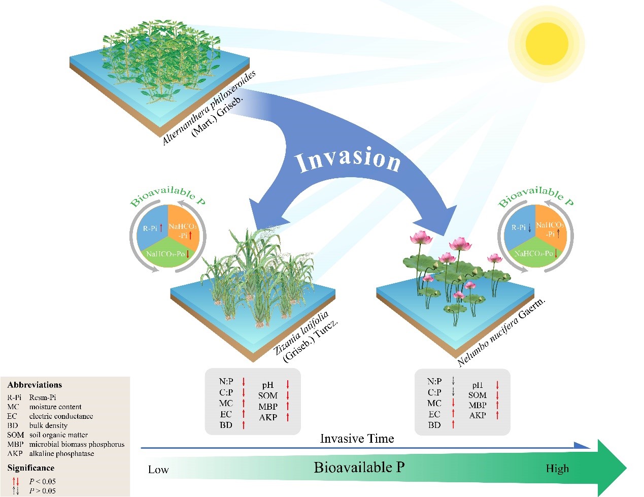 研究结果表明,在不同的河湖交错区中,喜旱莲子草的入侵显著改变了原生植物群落土壤的理化性质与生物有效磷的浓度,且这种影响效应不受到土壤基质异质性的影响。但不同原生植物群落对土壤有效磷含量的影响不同。与原生菰群落和莲群落相比,相邻喜旱莲子草的入侵使土壤无机磷浓度分别提高了39.5%和3.7%,有机磷浓度分别降低了32.7%和31.9%。此外,在喜旱莲子草入侵不同的原生植物群落时,喜旱莲子草会表现出不同的生长特征。这一差异主要是由于喜旱莲子草具有较强的资源配置能力和表型可塑性。并且喜旱莲子草的入侵对土壤磷生物有效性的影响是持续的,且随着入侵时间的延长而增强和扩大,这种加速的生物有效磷循环更有利于入侵者对养分的吸收,可能会对植物入侵产生正反馈。同时,喜旱莲子草的入侵促进了磷在河湖交错区的循环和积累,导致土壤N:P和C:P平均分别下降7.9%和12.5%,这可能会影响整个生态系统内部稳定的化学计量状态。这些结果强调了外来植物入侵对河湖交错区湿地生态系统磷养分循环的影响,这种影响可能不利于本土植物的后期恢复。