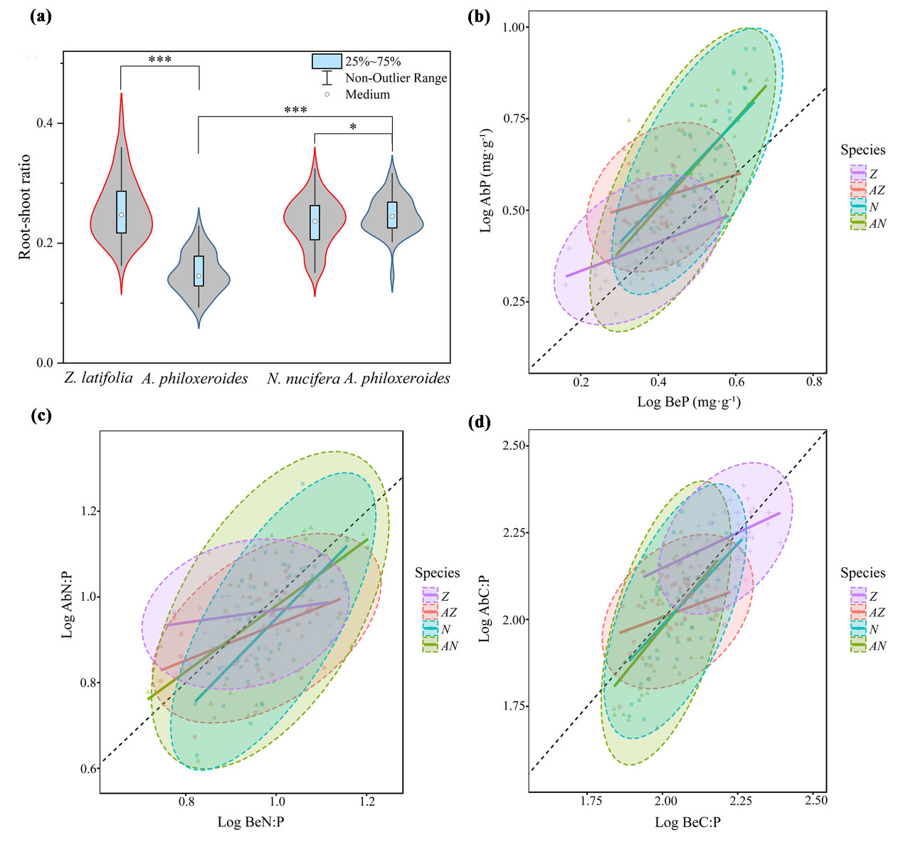 图3 本土物种菰和莲以及相邻的入侵物种喜旱莲子草的根冠比以及地上磷含量 (或N:P和C:P比) 和地下磷含量 (或N:P和C:P比) 的比例关系