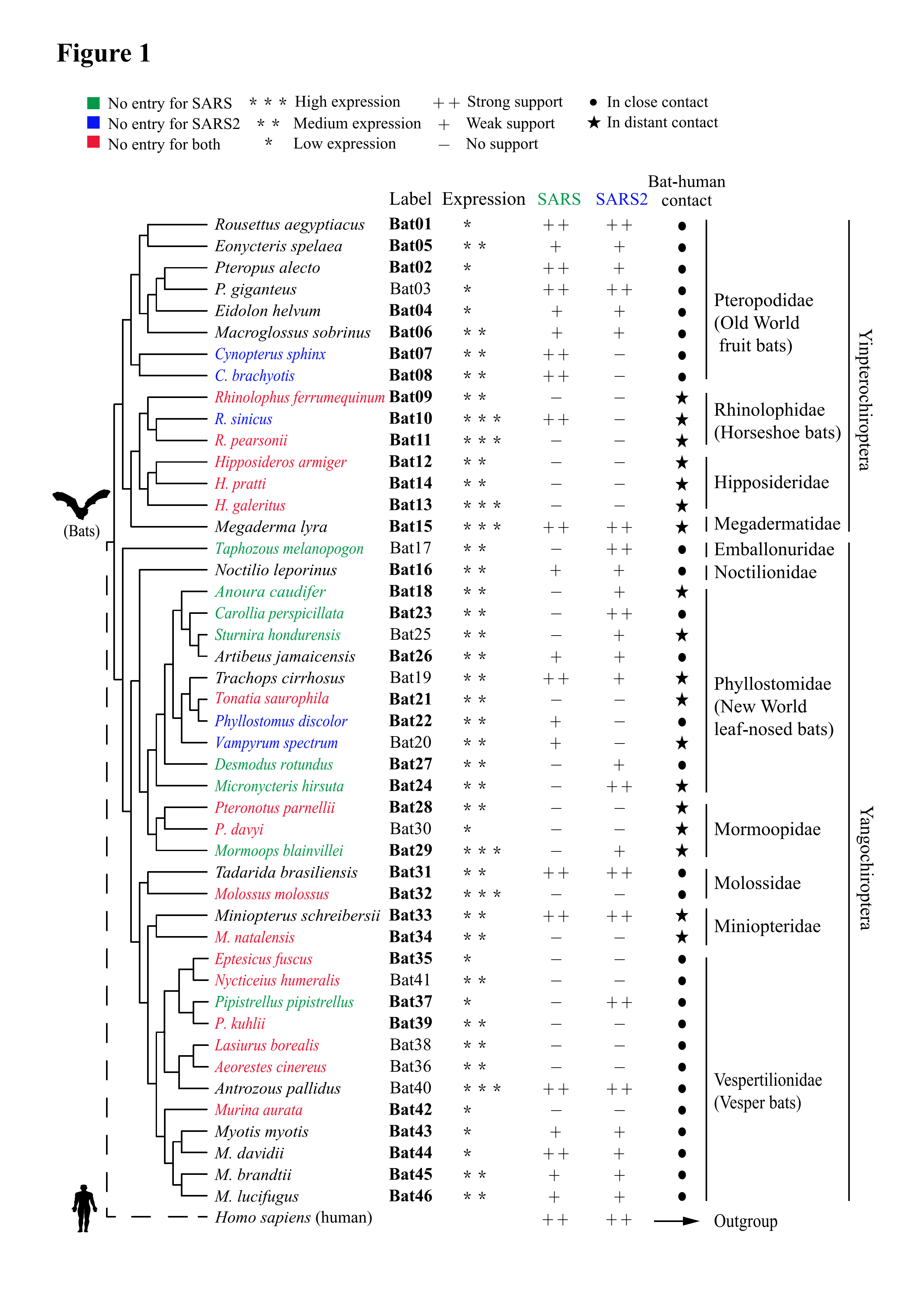 自新冠疫情爆发以来,蝙蝠一直处在舆论的风口浪尖上。研究表明,少数蝙蝠物种可能是人类冠状病毒的天然宿主,当前引发全球疫情的新冠病毒也可能起源于少数蝙蝠物种。然而,蝙蝠是一个有着1400多个物种的庞大哺乳动物类群,并非所有蝙蝠物种及其个体都有可能是人类冠状病毒的天然宿主。为了提供科学证据检测该假说,武汉老员工态学系赵华斌团队、病毒学国家重点实验室严欢团队、陈宇团队和蓝柯团队合作,将研究目标聚焦在血管紧张素转化酶2(ACE2);因为它是严重急性呼吸道综合征冠状病毒(SARS-CoV)、新冠病毒(SARS-CoV-2)的细胞受体,SARS-CoV和SARS-CoV-2能否利用不同蝙蝠物种的ACE2受体进入细胞可以提示这些蝙蝠是不是潜在的自然宿主。