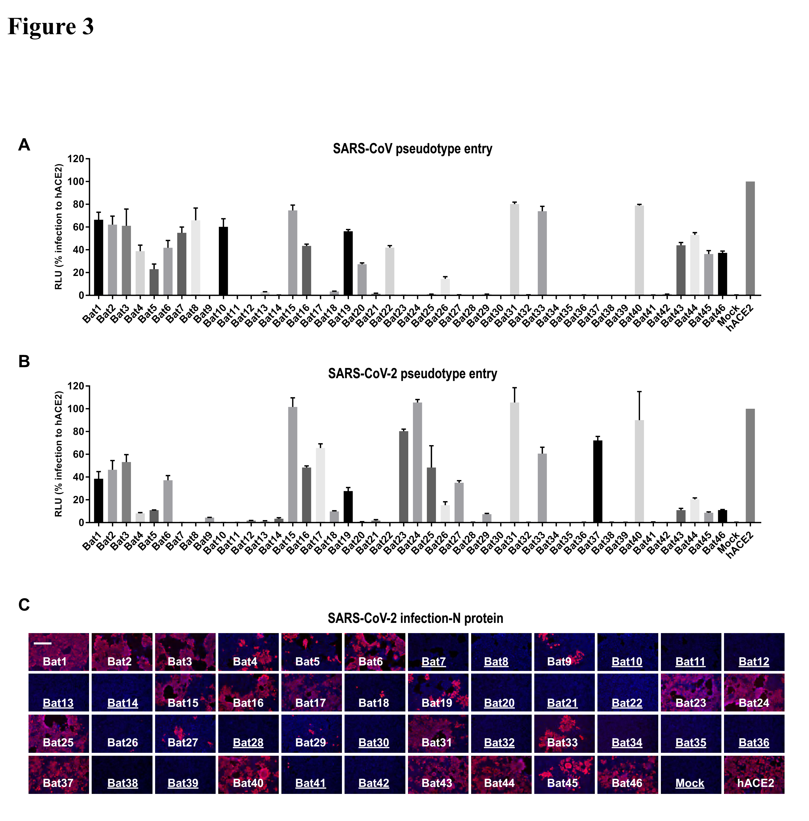 图3. 46种蝙蝠ACE2受体感染冠状病毒的实验结果