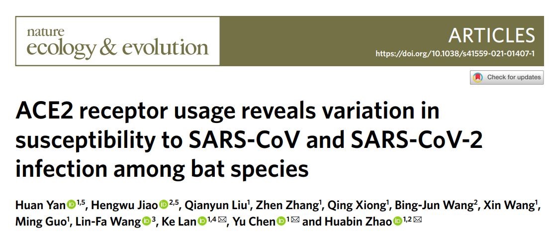 Nature Ecology & Evolution(《自然•生态与进化》)3月1日以长文(Article)形式发表了hahabet星辰大海病毒学国家重点实验室的最新研究成果,论文题为“ACE2 receptor usage reveals variation in susceptibility to SARS-CoV and SARS-CoV-2 infection among bat species”(ACE2受体的使用范围研究揭示了不同蝙蝠物种对SARS-CoV和SARS-CoV-2病毒感染能力的差异)。