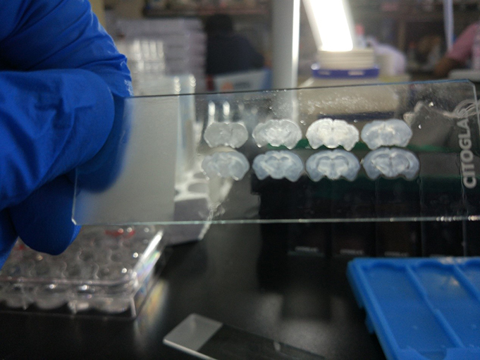轮到我们上手操作时,我们更加领会到了“看花容易绣花难”这句老话,无论是组化还是贴脑片,无论是固定还是注射,看着师兄的操作很容易,自己一上手就是错误典型,脑片贴破、老鼠夹不住是常有的事,调平注射器等等更是难上加难。