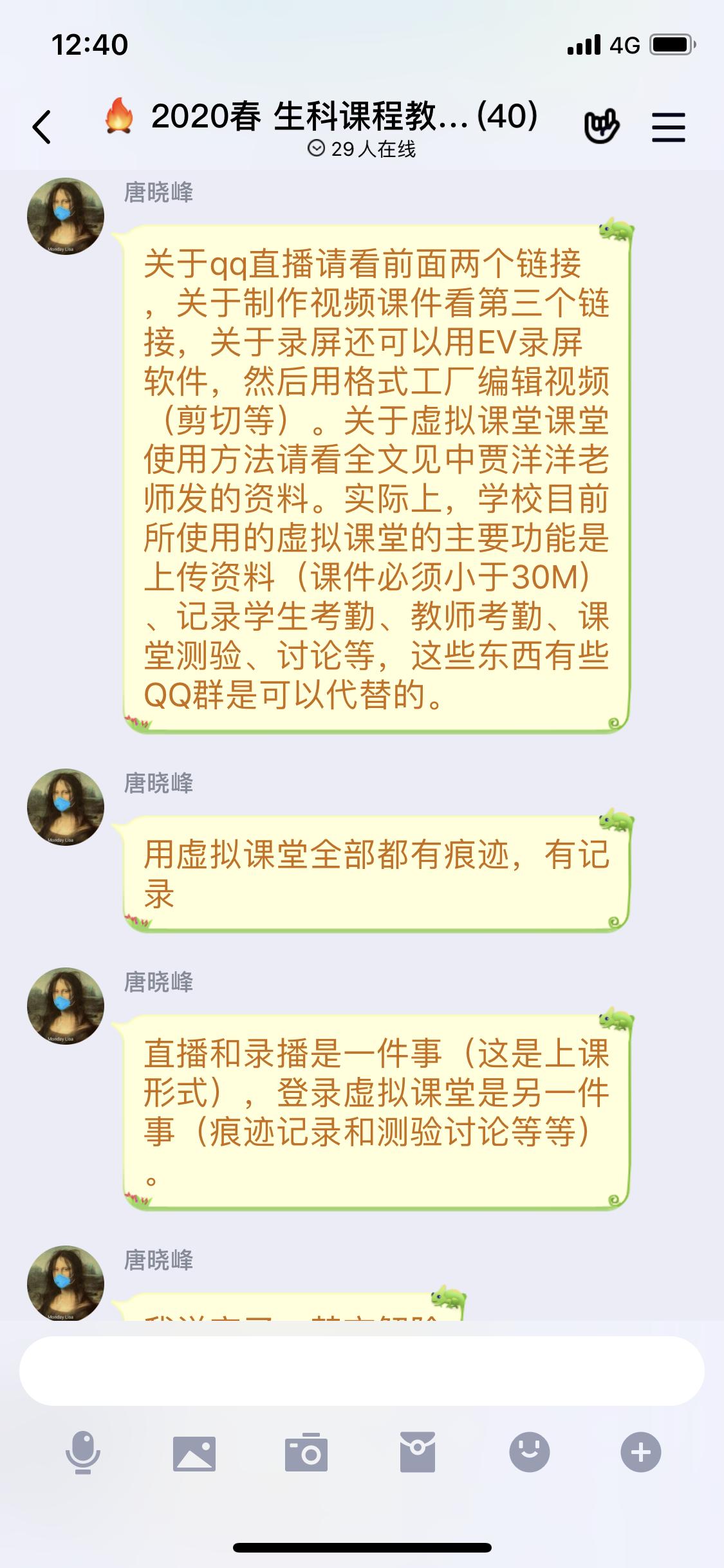 生科院有良好的在线课程平台基础,通过近几年的建设,有6门精品课程升级为系列数字课程(详情可见新闻稿http://ugs.whu.edu.cn/info/1121/7808.htm),极大方便了员工在课前进行预习,资料的查找等。而没有数字课程的课程任课老师克服了员工没有教材、家中设备不全、国外时差等各种困难,齐心协力认真准备在线课程。公司课程除了部分有慕课和精品在线课程外,其他的都需要用到各种在线平台授课,老师们课前除了参加学校组织的培训,学院同时利用教师教学发展平台,请唐晓峰教授给大家进行了一次QQ授课培训,老师们参与度很高,学习反响很好,对在线授课又多了一份把握。