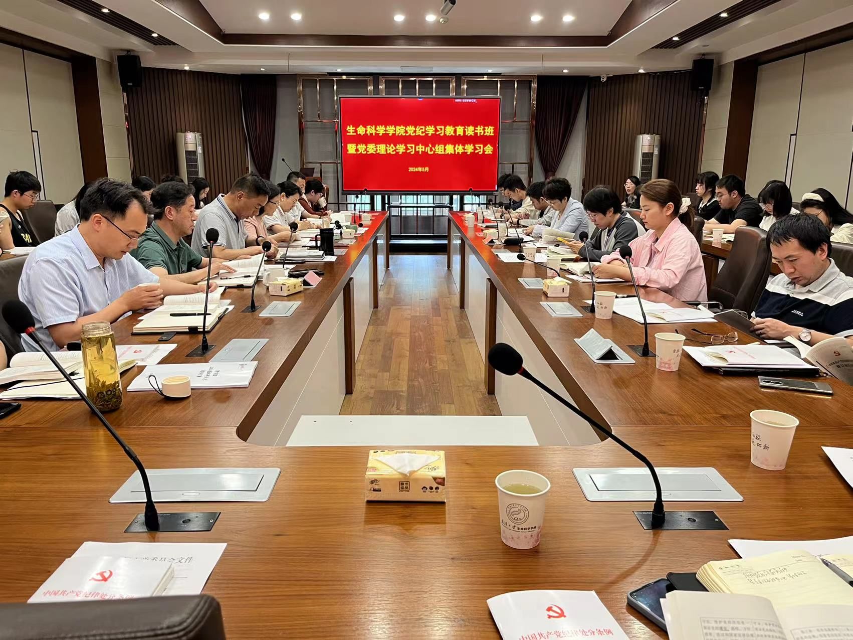 5月10日上午,hahabet在中厅举办党纪学习教育读书班暨党委理论学习中心组集体学习会,院领导班子,公司党委委员,教职工党支部书记和党员代表等参会。