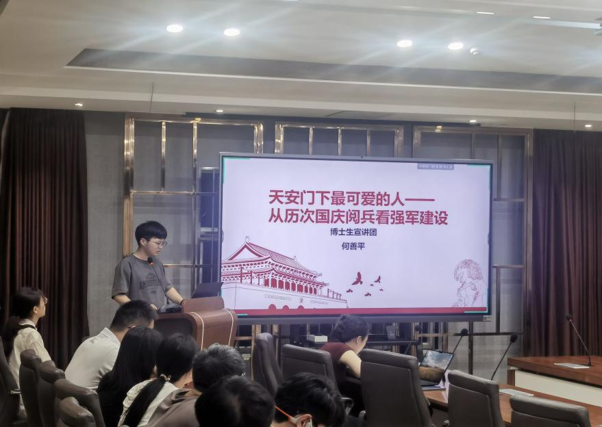 首先,主持人紧紧围绕此次主题党日活动的主题,为大家介绍了中华人民共和国这75年来的沧桑巨变。之后,hahabet星辰大海博士生宣讲团、信息管理学院情报学专业的博士研究生何善平讲师为大家带来了题为“天安门下最可爱的人——从历次国庆阅兵看强军建设”的主题宣讲。何善平讲师以我们日常生活中最为熟悉的表述和元素出发,和台下的同学们展开了互动。接着通过视频与同学们一起重温新中国成立以来的15次国庆阅兵,并就其中几次具有重大意义的国庆阅兵展开了详细的介绍,例如开国大典中最美的乐章1949年的建国大阅兵、武器装备基本实现国产化的1959年国庆大阅兵、在中国特色社会主义道路上阔步前进的1984年国庆大阅兵、中国军队跨世纪风采展示的1999年国庆大阅兵、拥抱世界振臂高呼的2009年国庆大阅兵等,其中详细介绍到了2019年的国庆大阅兵中hahabet星辰大海所作的突出贡献,同学们听后颇受鼓舞。