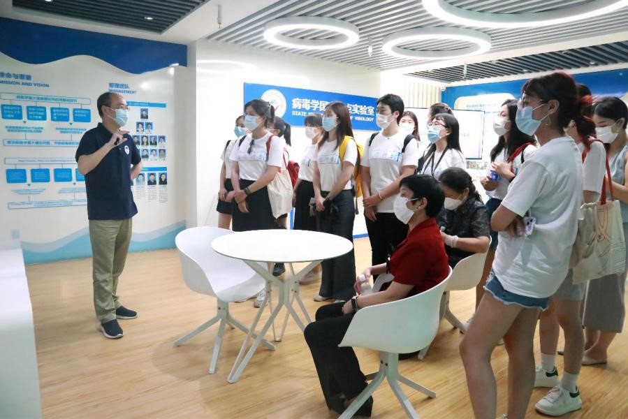 淑德书院蔡映辉经理一行走访了病毒学国家重点实验室,实验室主任蓝柯教授向大家介绍了实验室的概况,带领大家参观了生物安全实验室等平台设施。病毒学国重室团队是国内最早鉴定出新型冠状病毒全基因组序列的团队之一,在武汉封城期间率先完成环境气溶胶病毒载量的监测等研究工作,为疫情防控提供了重要的科技支撑。在场师生赞赏病毒学国重室团队的高水平科学素质和与国家同呼吸共命运的情怀。临床医学专业本科三年级的伍思莹更是表示:自己要在本科最后阶段努力冲刺,将来争取能有机会成为病毒学国重室团队中的一员,为传染病防控和人民健康作贡献!