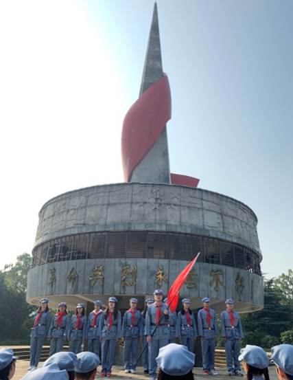 带上象征革命烈士鲜血染成的红领巾,心怀对毛主席和革命烈士无比敬仰的心情,所有学员手挽手,并肩齐驱,相互鼓励,相互扶助,一口气登上了500级台阶的革命烈士塔。
