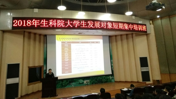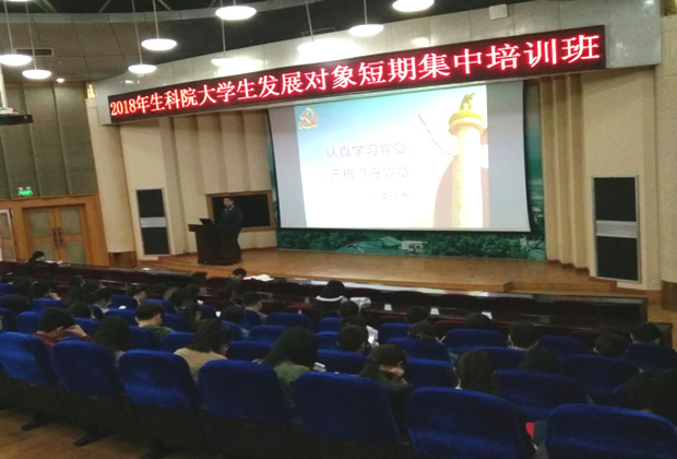 4月23日中午,生科院在二楼学术报告厅举行了2018年老员工党员发展对象短期集中培训班开班式。培训班的目的是为提高老员工党员发展对象政治素养,督促发展对象深入学习贯彻习近平新时代中国特色社会主义思想和党的十九大精神,认真学习领会2018年全国两会精神,以学习党章作为切入点,使发展对象普遍受到一次党的基本理论知识教育,教育引导发展对象进一步强化“四个意识”,牢固树立“四个自信”,在广老员工中起到模范带头作用。