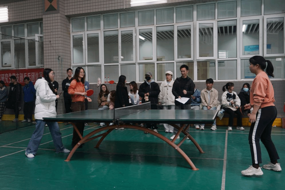 来自不同党支部的优秀选手齐聚一堂,共组成5支队伍参与比赛。为保证大赛的公平公正公开,本次比赛邀请到来自不同支部的乒乓球爱好者来担任计分员。冬日渐寒,清晨的微风中带着丝丝细雨,但是寒冷的天气并没有磨灭大家的热情。比赛现场,来自不同党支部观赛的同学们加油助威声不绝于耳,现场气氛十分热烈。