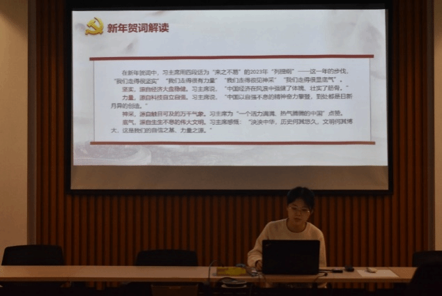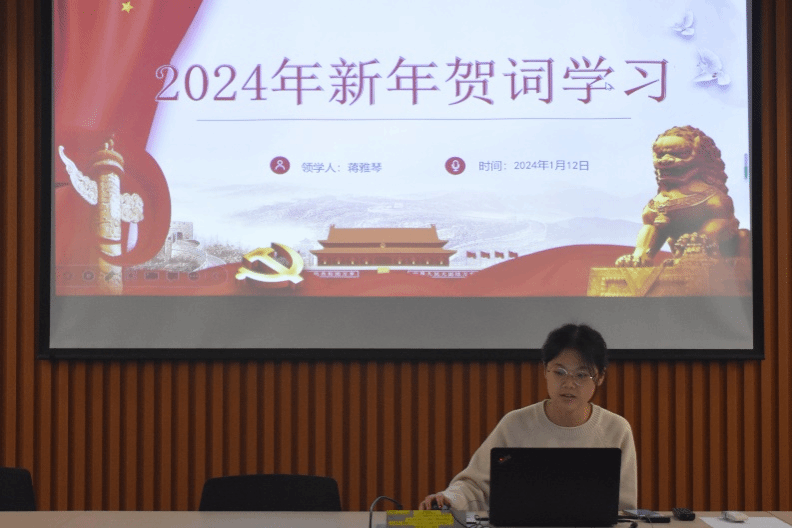大家首先对习近平总书记2024年新年贺词全文进行了阅读和学习。在新年贺词中,习近平总书记用“坚实、力量、神采、底气”四个词语总结2023年,对过去一年国家在经济、科技、文化、外交等方面的成果做出概括,并对2024年做出展望。领学人对新年贺词进行了详细的解读,大家通过对新年贺词中蕴含的重要思想和精神内涵的深刻领会,加深了对党的理论和路线方针政策的理解和认识,增强了自身的责任感和使命感。